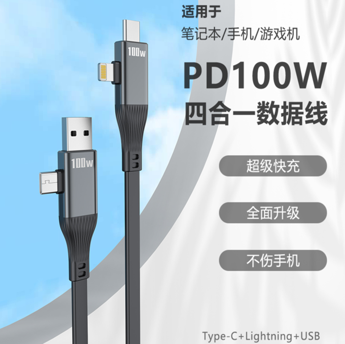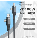 四合一PD100W快充数据线,一条满足所有(TyPe-C+Lightning+USB);适用于笔记本、手机、游戏机的100W超级快充数据线;全新升级不伤手机。